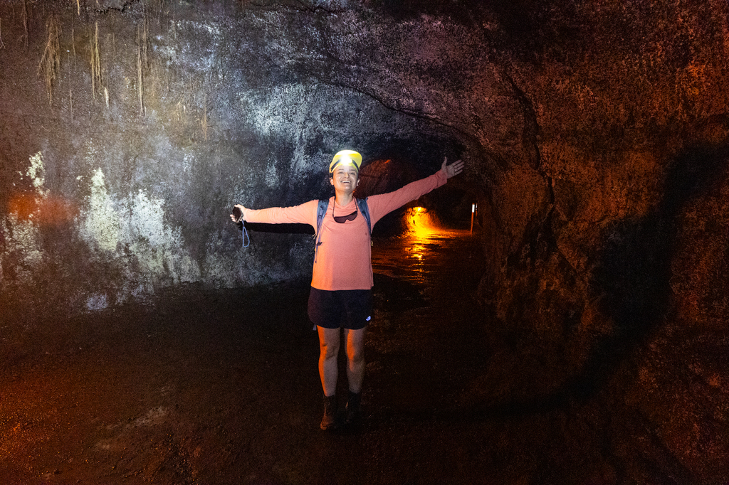 The Nāhuku Lava Tube Trail (Thurston Lava Tube) offers a completely different perspective on Hawai’i Volcanoes National Park. This short, easy trail takes you underground through a massive lava tube. The walk to the tube passes through a lush rainforest, which is a sharp contrast to the volcanic landscapes elsewhere in the park. The cave is lit, but it can be dark and uneven in spots, so sturdy shoes are helpful. The temperature of the lava tube is cool, but not super cold. Headlamps and a light jacket can be helpful, but aren’t necessary.